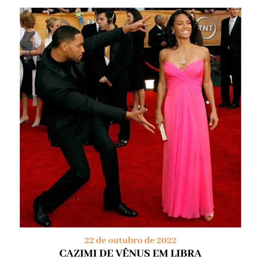 Hoje é um dia especial porque a Vênus alcança o coração do Sol, é Cazimi! Cazimi ainda mais especial porque acontece em um signo especialíssimo para os dois pombinhos, é a casa da Deusa e a queda do Deus. O Sol apaixonado pela Vênus hoje, por fim, cai aos seus pés e isso é maravilhoso. É dia de tratar sua esposa como ela merece e saber que ela não merece nada menos do que tudo! O Sol e a Vênus em Libra como no mapa natal de Will Smith, sim, esse que perdeu tudo, a paciência, as estribeiras, o rumo, mas não perdeu a sua maior sorte, sua mulher, seu amor, Jade Pinkett. Aos 29 graus do segundo tempo a Vênus encontra domicílio nos seus braços. O encontro é quase uma despedida, amanhã no raiar do dia o Sol cava o buraco do Escorpião e sai das vistas de Afrodite. Se é certo se é errado ninguém sabe. O importante é que a vida é hoje então coloca a Lua em Virgem no bolso e não pensa em nada. Amanhã é outra história.