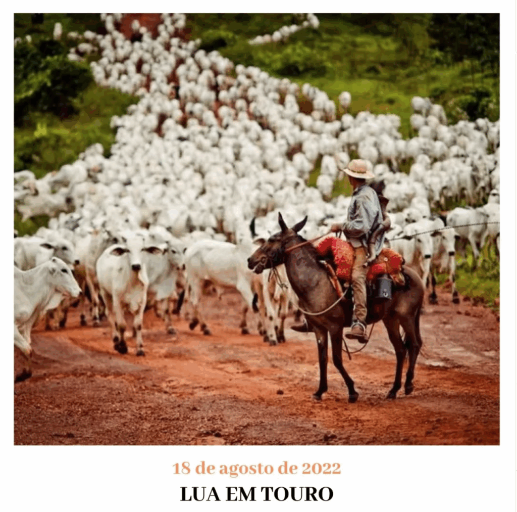Toca o berrante, junta a boiada. A previsão hoje é de 38 graus no baixo Araguaia. A Lua segue em Touro fazendo nosso peito pastar em conhecido terreno. Isso não quer dizer que o dia será ameno. A Lua busca um trígono com Mercúrio que faz a travessia com a maestria. Às 16h, além dele, a Deusa encontra Saturno por quadratura, autorização do porteiro para seguir adiante. Noutra cena, um tanto menos palpável, um pouco mais flamejante, a Vênus em Leão fecha um trígono com Júpiter em Áries, o desejo, a vontade. A Lua segue seu prumo rumo à Marte que está no último grau do Touro. Há coisas importantes a serem encerradas até a manhã da sexta feira quando ela finalmente dá a autorização para que Marte saia do seu atolero. Amanhã o Touro desempaca. Aproveita a deixa e vai pra Gêmeos com a Lua fazer sextil a Júpiter no signo dos raios. Cabrum! Um Touro sai da inércia. Vai chover.