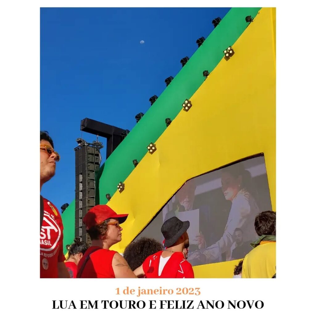 São 19h34 do dia 31 de dezembro de 2022. A Lua, no momento em que escrevo, cresce exaltada no meio do céu da cidade de Brasília. Touro não lhe confere a preguiça como de costume. A Deusa cresce sob seu signo, mas também condimentada pelo tempero da cólera própria de sua fase. Mamífero, o povo é capaz de devorar o país com a fome de um recém nascido. Amanhã a Lua fará um trígono com o presidente, a quem não precisa explicar a sua situação. Se tem uma coisa que o Sol em Capricórnio compreende é o peso da necessidade. Touro e Cabra, quadrúpedes ambos, signos mudos. Se entendem pela língua do corpo, da fome e da saciedade. Com oito patas no chão e com Júpiter já não mais em Peixes, não somos capazes de dizer que amanhã tudo se transformará como o milagre da água ao vinho. Mas vejo bandeiras vermelhas nas ruas da capital do meu país e me permito acreditar em alguma justiça nessa terra. Acredito porque preciso e luto porque acredito.